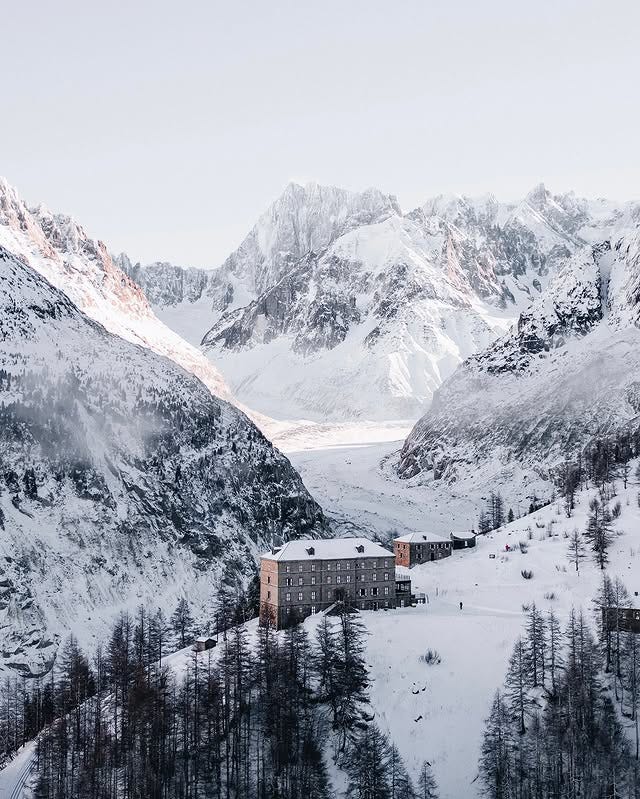 (DRØMMER OM) Bare et brandfedt gammelt refugie i 1913 meters højde lavet om til et hotel med nogle brandfede værelser i mørkt træ. Man tager det lille tog, som alle der har været Chamonix kender, fra byen og op til kanten af gletsjeren, hvor hotellet ligger. Der er fuld Wes Anderson-plade og jo som bekendt noget af Europas dejligste off-piste ude for døren.